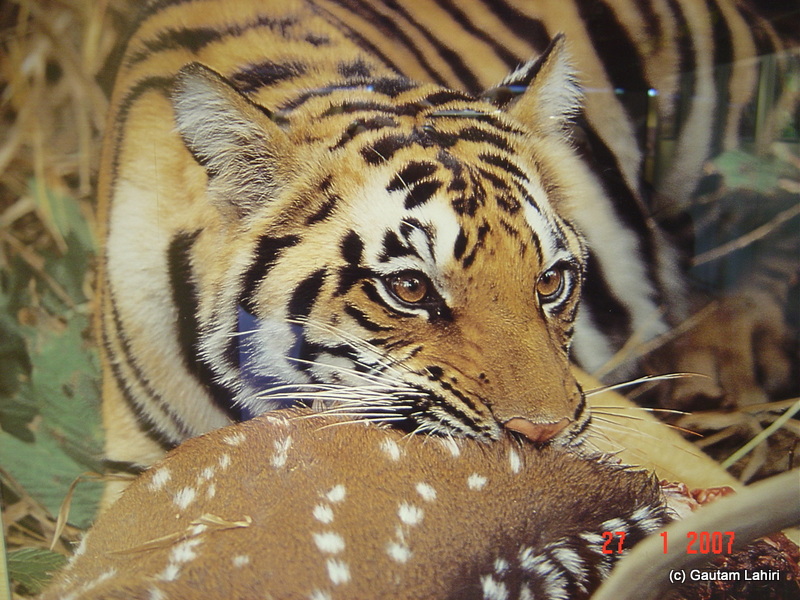 A tiger attacking its prey brought to life by the picture at Kanha's museum at Kanha forest by Gautam Lahiri