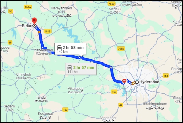 | Distance from Hyderabad to BIDAR | 142 Kms |