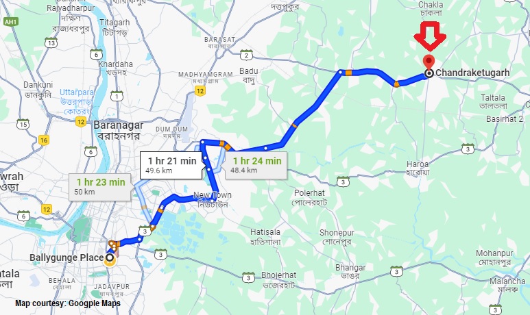 | Distance from Kolkata city to Chandraketugarh | 56 Kms, one way |