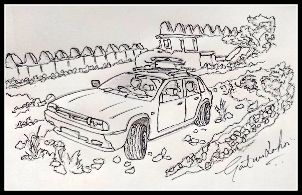 At first, the car’s front wheels spun furiously, and we did make grounds but after about six feet of movement, the entire car slid back on the rocky road below. The only way if I could climb was by reversing the car all the way up as the engine gets maximum torque which can be harnessed. I came down, reversed, and started my climb again backwards.