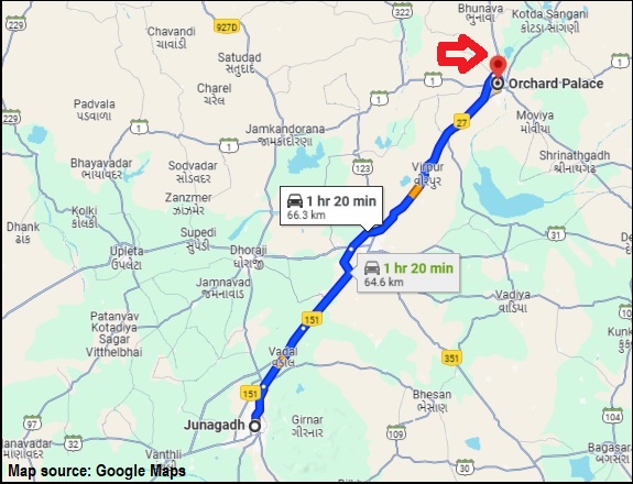 | Distance from Junagadh to the Orchard Palace | 66 kms |